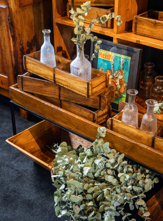 Um dos pontos centrais da AD. Studio é a ressignificação de peças. Ou seja, fôrmas de tijolo holandês do início do século 20 podem servir como bandejas. Um engradado francês para bebidas, da mesma época, faz a vez de cachepô.