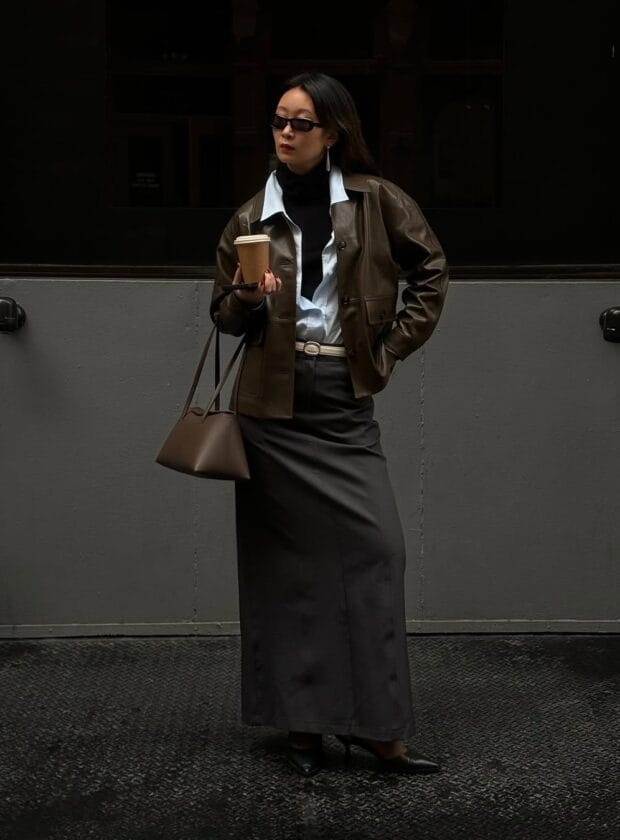 A blusa marrom com textura pesada ganha mais força combinada ao casaco longo da mesma cartela. A chave aqui é o jogo de proporções e materiais. Aposte em uma calça clara para completar a paleta.