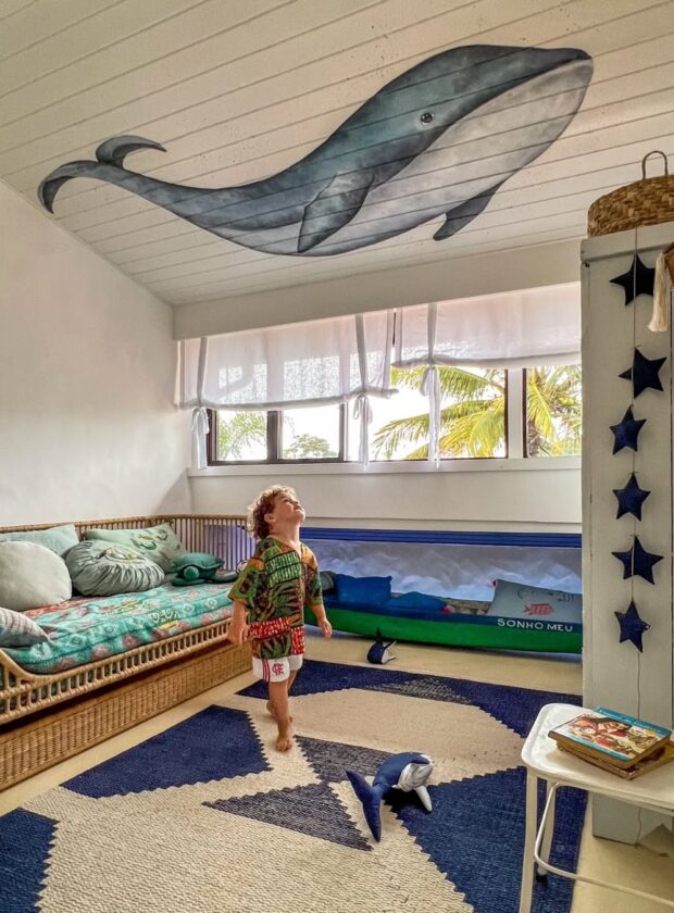 Quarto de criança dos sonhos, com canoa e pintura de baleia