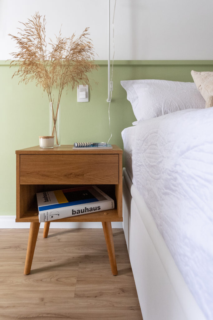 Neste studio com 40 m², o arquiteto Raphael Wittmann adicionou uma pitada de cor ao nomear o verde-oliva para a composição da meia-parede. Com arquitetura de interiores na linha natural chic, o projeto valoriza a força da madeira em sua forma original e no porcelanato. Ademais, o uso de plantas complementa o conceito, reforçando a ideia de conexão com a natureza e bem-estar. Dessa forma, o resultado é uníssono com o propósito de agradar e proporcionar ao morador um espaço de tranquilidade.