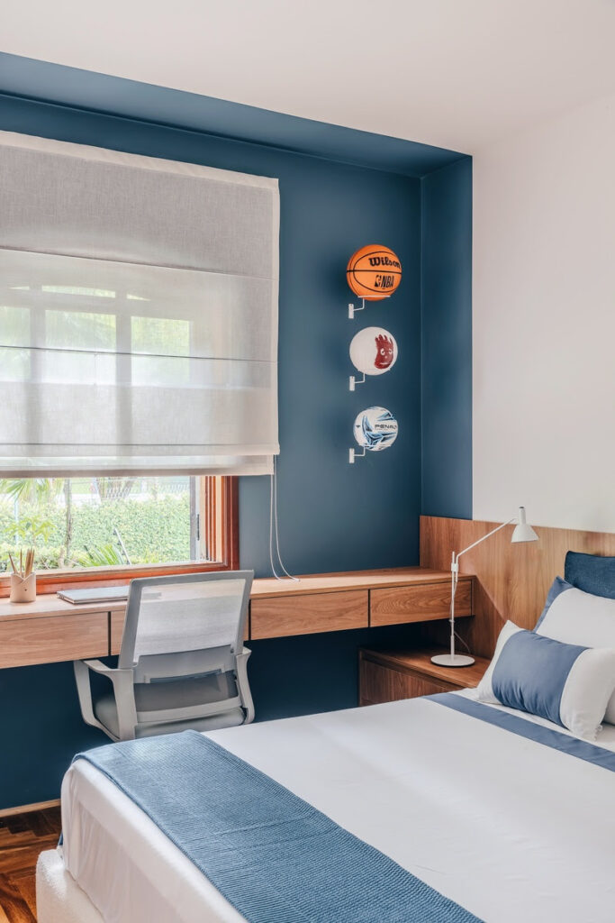 No primeiro projeto, o quarto de um jovem ganha personalidade com a Cor Sino da Igreja, um azul profundo que reveste a parede principal. O contraste com os móveis de madeira clara e detalhes brancos na decoração cria um visual moderno e equilibrado. A cor transmite calma e, ao mesmo tempo, imprime identidade, valorizando objetos decorativos como as bolas na parede, que se destacam sobre o fundo escuro. É uma solução atemporal, perfeita para acompanhar diferentes fases da vida.