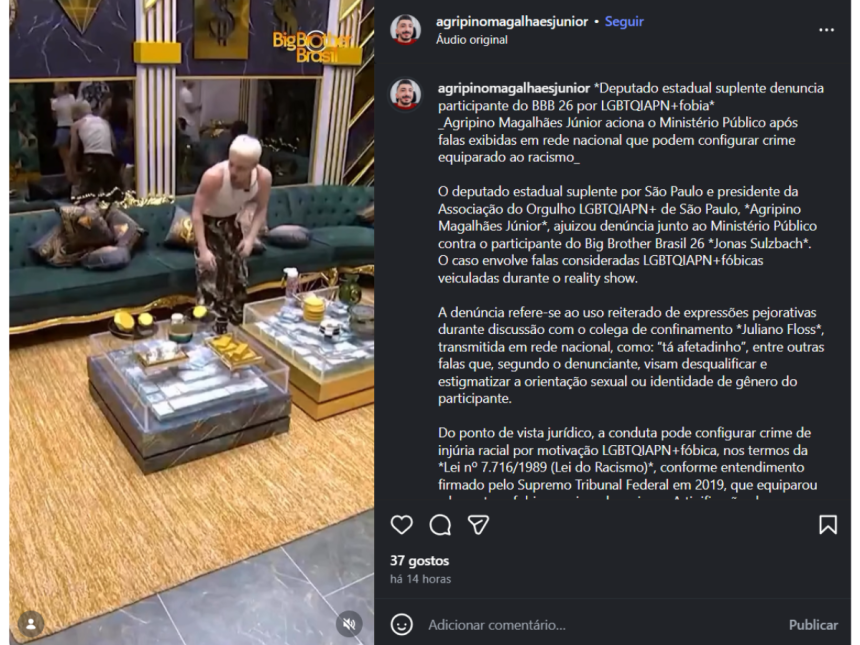 O deputado estadual suplente por São Paulo e presidente da Associação do Orgulho LGBTQIAPN+ de São Paulo, Agripino Magalhães Júnior, protocolou uma denúncia junto ao Ministério Público contra Jonas Sulzbach. O caso envolve afirmativas consideradas LGBTQIAPN+fóbicas proferidas durante o programa “BBB26”, direcionadas ao participante Juliano Floss.