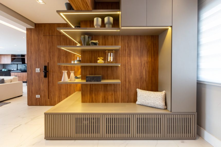 Para deixar o espaço mais caloroso e funcional, Daniela recorreu à marcenaria e projetou soluções integradas neste apartamento. Assim, ela concebeu um combo acolhedor, pensado para abraçar quem chega logo ao entrar no ambiente. Ademais, esse espaço reúne uma pequena área de estar com chapelaria, sapateira e banco, ideal para calçar ou aguardar alguém.