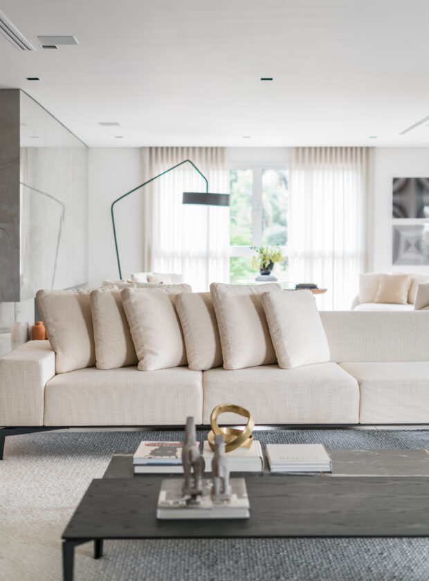 Neste projeto da arquiteta Ana Rozenblit, a sala serve para receber as visitas e também é usada como uma extensão da varanda. Por isso, a profissional escolheu um sofá de design retilíneo e 2,90 metros de comprimento revestido de bouclé liso, da +55design.