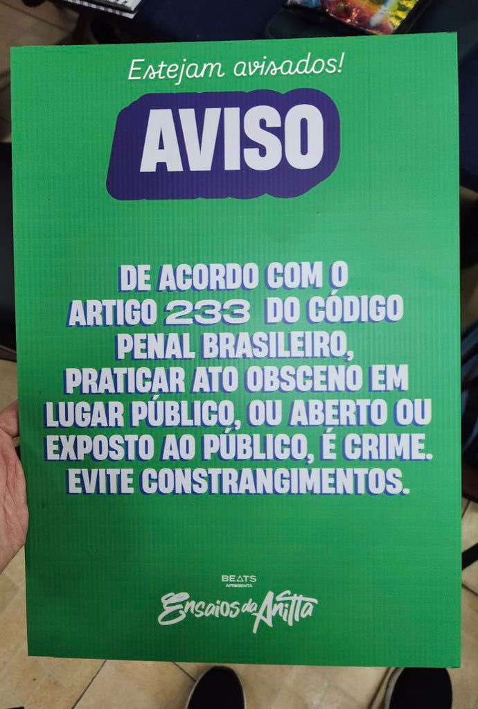 O clima de Carnaval já tomou conta do país, mas a organização dos “Ensaios da Anitta” decidiu garantir que a empolgação dos foliões não ultrapasse os limites da lei. Quem marcou presença no evento se deparou com um aviso nada discreto — e bastante direto — espalhado pelo local.