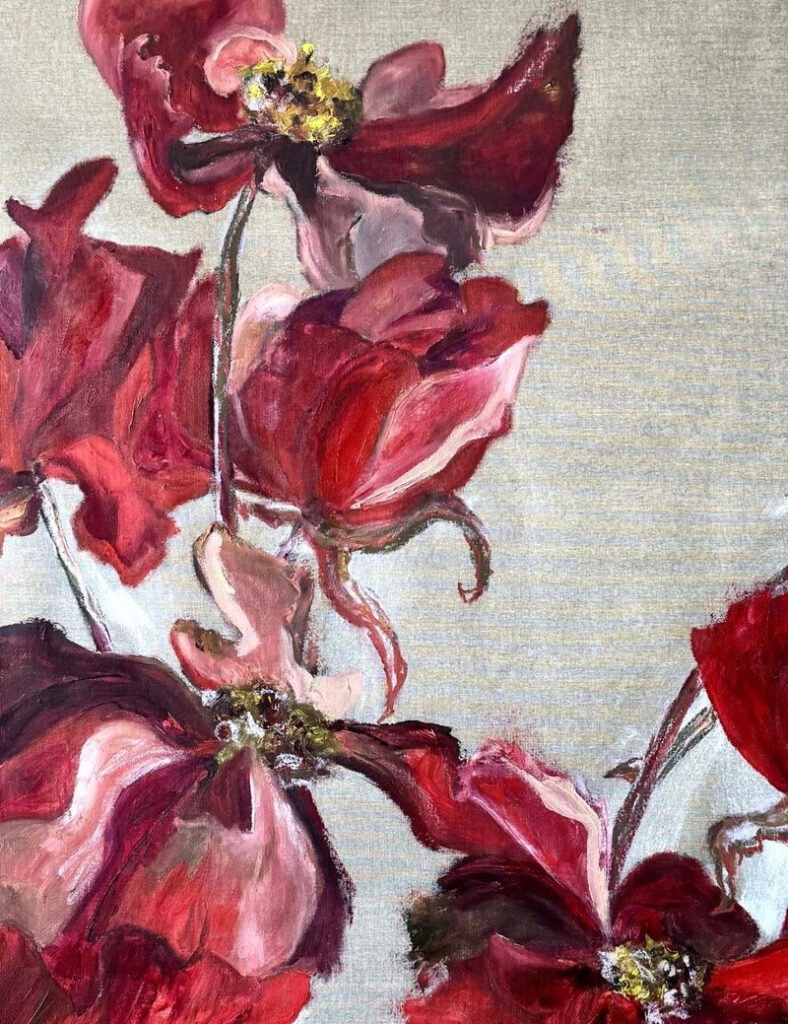 Nas obras de Fabiana Queiroga, o tempo se revela de forma singular. Em seu modo particular de calcular os instantes da vida, a artista segue uma linha temporal em que a memória funciona como ponto inicial. Ademais, conecta-se à sua linhagem materna, trazendo referências afetivas que influenciam seu processo criativo e sensível. Aos poucos, a ancestralidade se torna presença, com nascimento, duração e morte convergindo na matéria. E é nesse encontro que se evidencia a força do híbrido, com telas em tons avermelhados em pintura a óleo e detalhes marcantes. Além disso, a artista usa tecidos reciclados de garrafas PET e descartes da indústria da moda para fazer os bordados, reforçando a sustentabilidade.