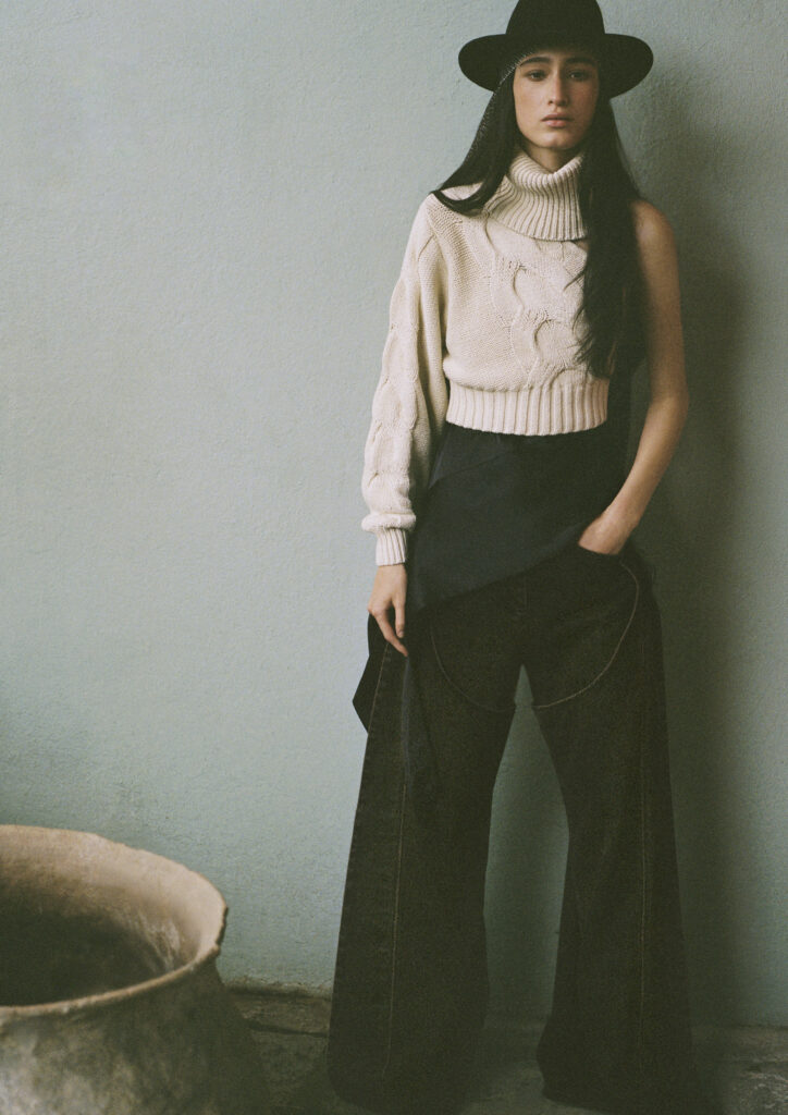 Explorada sob a ótica de sua herança pessoal e cultural, Lorena Saravia constrói um guarda-roupa altamente versátil, incluindo alguns de seus estilos mais desejados. A coleção de 29 peças equilibra a força das silhuetas estruturadas, como jaqueta jeans e calças de couro com recortes, best-sellers da marca. Além disso, inclui looks noturnos sensuais, trazendo blusas drapeadas e vestidos de costas abertas que reforçam a estética sofisticada e a identidade contemporânea. Dessa maneira, a proposta une versatilidade e ousadia, entregando peças que transicionam do dia para a noite, sempre mantendo personalidade e assinatura de estilo. Urbana e versátil, a coleção é um tributo ao México, evidenciado em tecidos de inspiração utilitária e em detalhes feitos de forma artesanal. Ademais, botas cowboy e a paleta de cores permeada por tons poéticos do deserto completam a proposta e reforçam sua conexão cultural única.