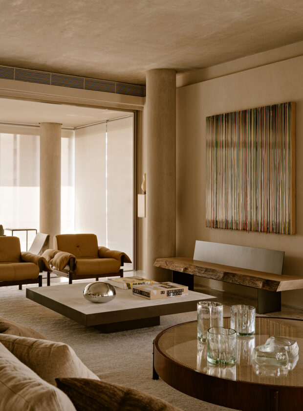 Com materialidade forte, inspirada na laje e em pilares de concreto aparente da estrutura do prédio, a proposta buscou justamente o equilíbrio entre a estética contemporânea e uma atmosfera aconche­gante. “A luz natural, a natureza e a arte foram elementos estruturantes desde o início e cada decisão foi pensada para re­forçar a sensação de continuidade e acolhi­mento”, detalha o profissional.