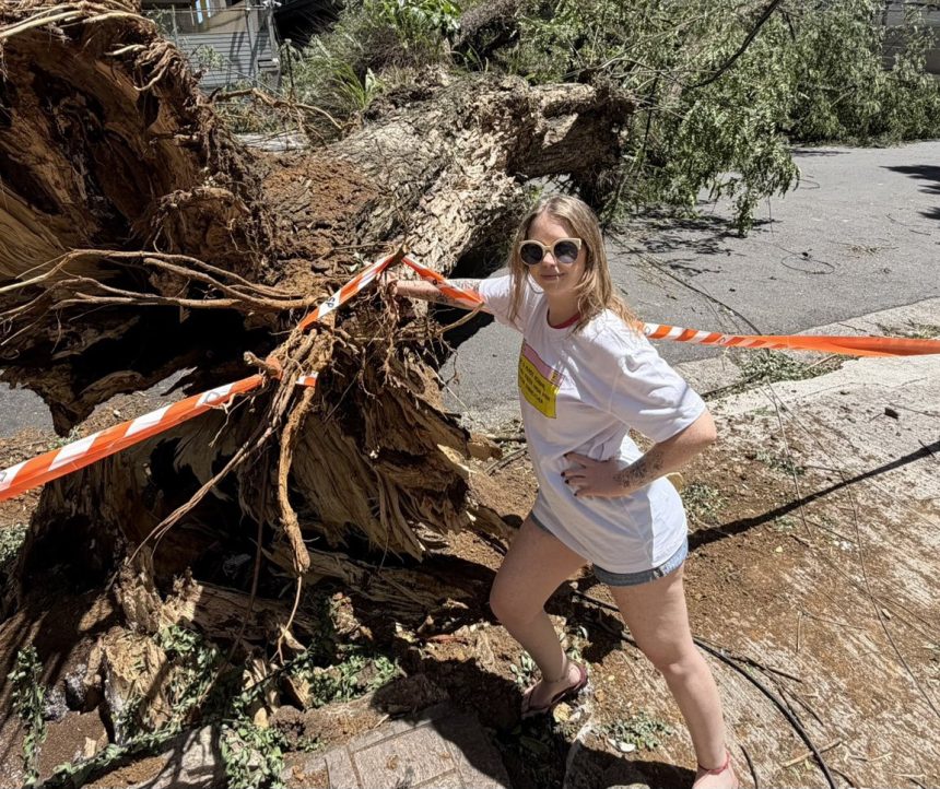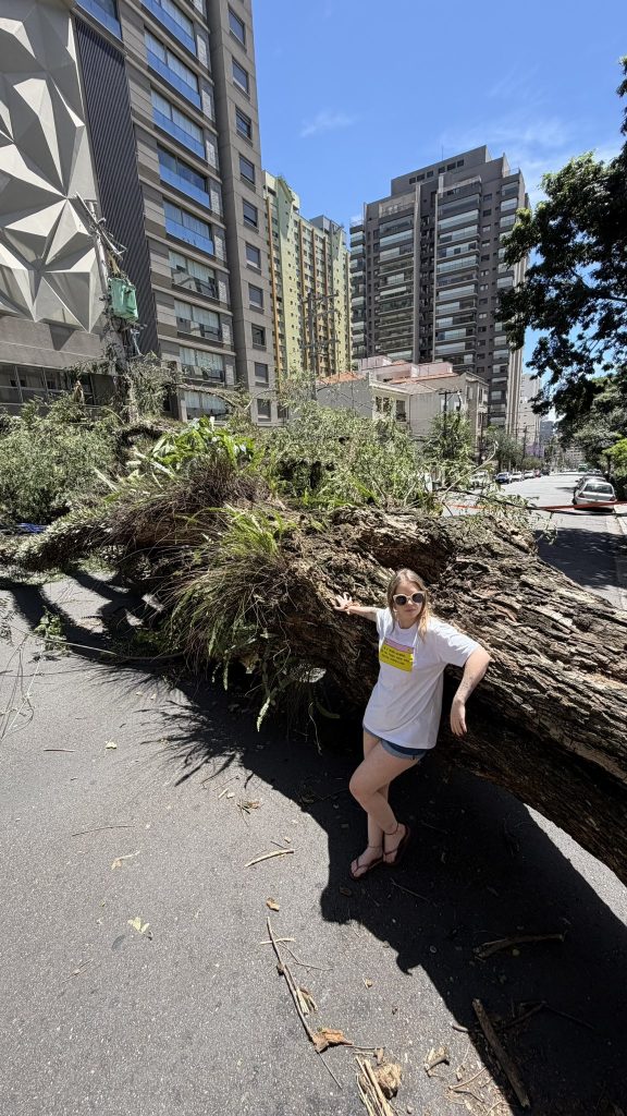 Em uma publicação que rapidamente viralizou nas redes sociais, Raquel compartilhou uma sequência de fotos onde aparece posando “plena” ao lado de uma enorme árvore tombada em uma calçada da capital paulista. Na legenda, ela ironizou a situação da cidade: “Quem disse que não dá pra fazer turismo ecológico em SP?”.
