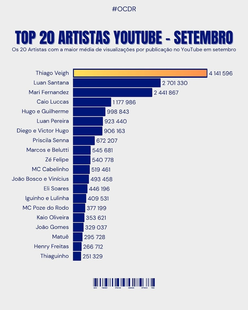 Veigh alcançou um marco significativo ao se posicionar entre os 20 artistas com maior número de visualizações no YouTube Brasil em setembro, segundo dados da Zeeng BR. O rapper aparece como Top 1 do YouTube no mês, com uma média superior a 4 milhões de visualizações por publicação, superando nomes consagrados da música nacional como Luan Santana e Mari Fernandez.